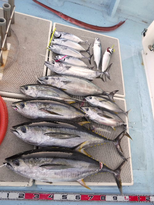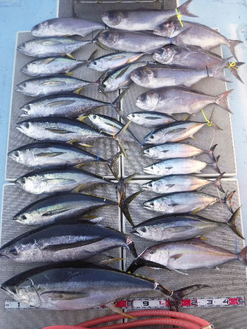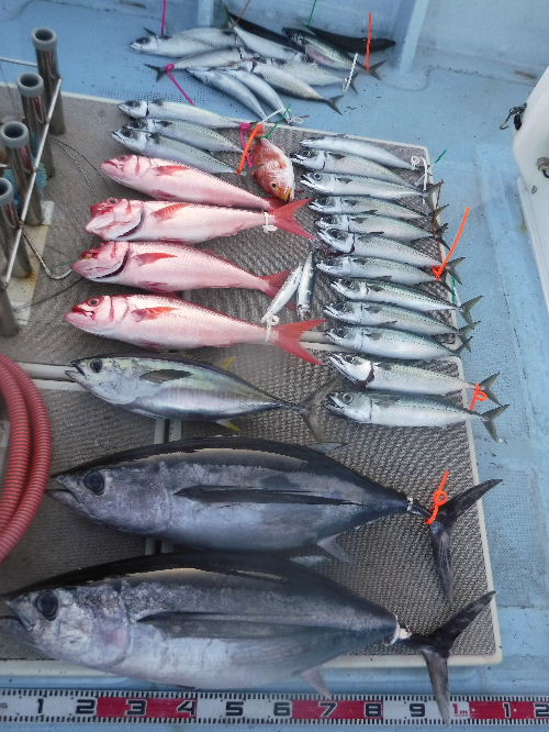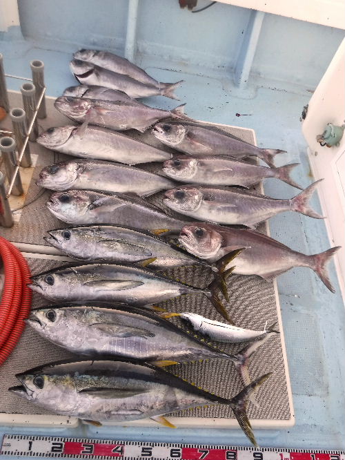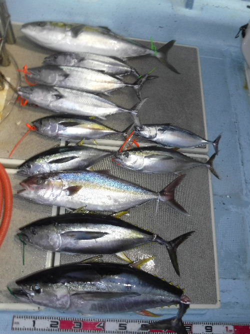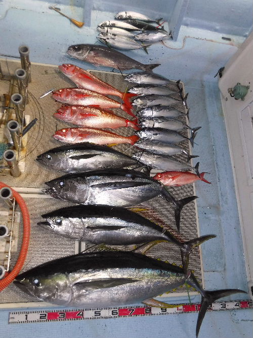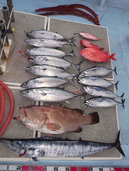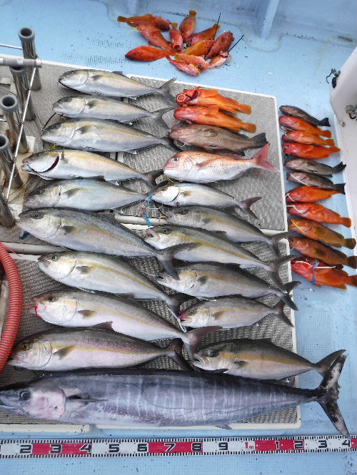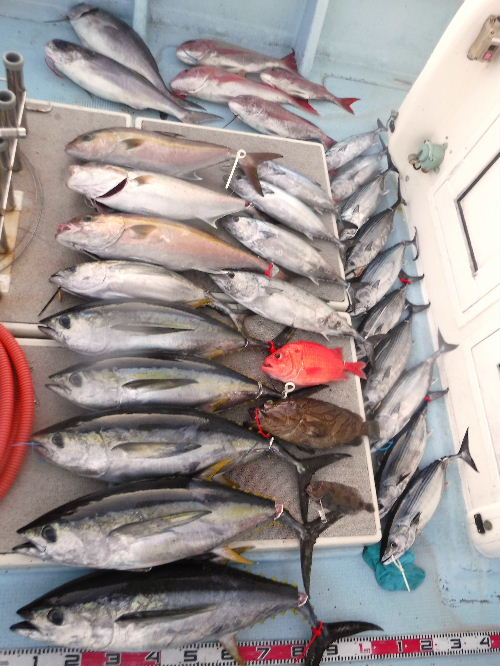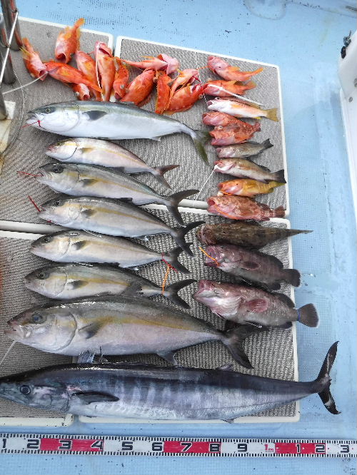 カンパチ〜33,0キロ カツオ〜5.8キロ メダイ キメジ マダイ ヒラソウダ ヒメダイ マダイ ヤガラ |