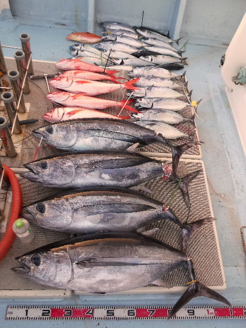 マハタ スマ ハガツオ カツオ キメジ ヒラソウダ マダイ カンパチ ヤガラ サバ |